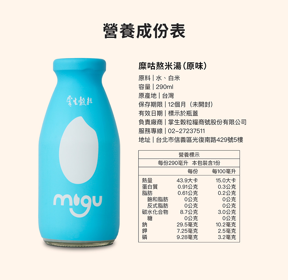 內容物名稱: 糜咕熬米湯(原味) 內容物淨重(容量)或數量: 290ml /瓶,共12瓶入/箱 是否含肉品: 否 原產地(國): 台灣 保存期限(天): 365 廠商名稱: 掌生穀粒糧商號股份有限公司 廠商電話: 02-27237511 廠商地址: 台北市信義區光復南路429號5樓 投保產品責任險字號: 0525字第26AML0000307號 食品業者登錄字號: A-153326929-00000-7 效期說明: 12個月(未開封) 以消費者收受日起算,至少距有效日期前91日以上。 消費者收受商品之有效日期若短於上述期間,本公司將於接獲通知後協助辦理退換貨。