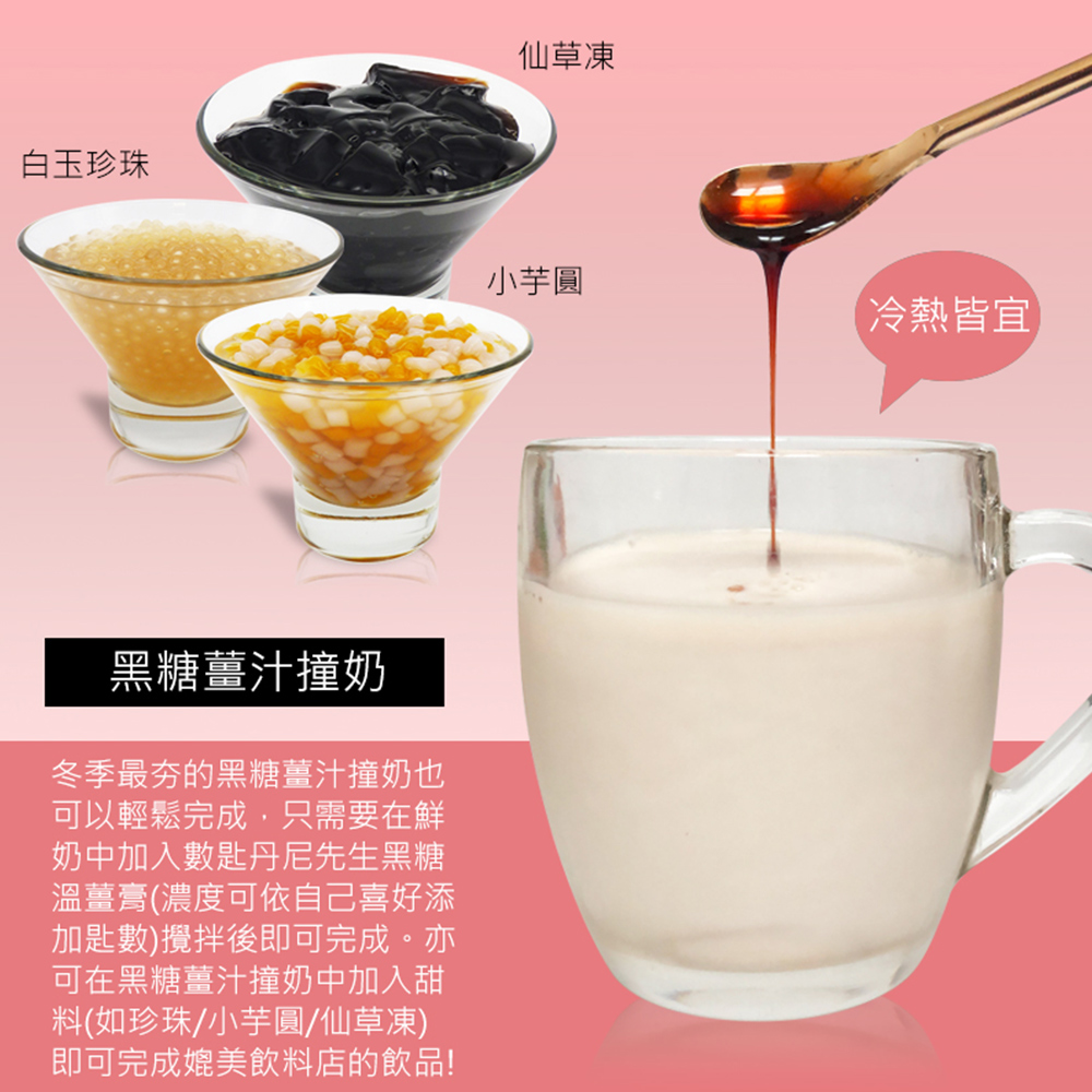 想更換口味也可以在鮮奶中加入丹尼先生黑糖溫薑膏做成『黑糖薑汁撞奶』,也可再加入自己想吃的料,如:珍珠、小芋圓、仙草凍、米苔目、粉角等甜料,就可以完成好喝又好吃的甜品!