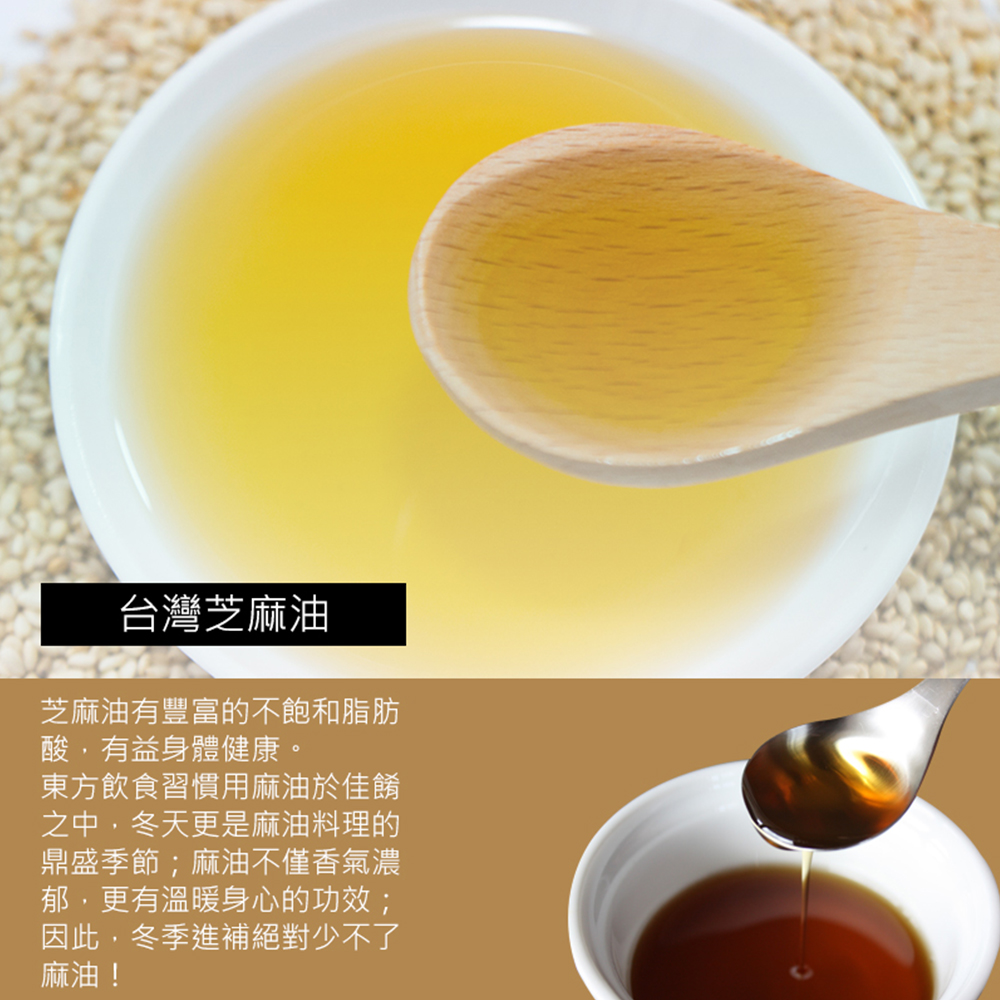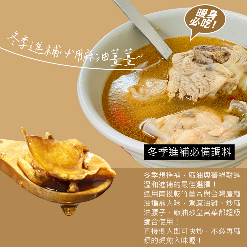 選用南投乾竹薑片與台灣產麻油煸煎入味,煮麻油雞、炒麻油腰子、麻油炒皇宮菜都超級適合使用!