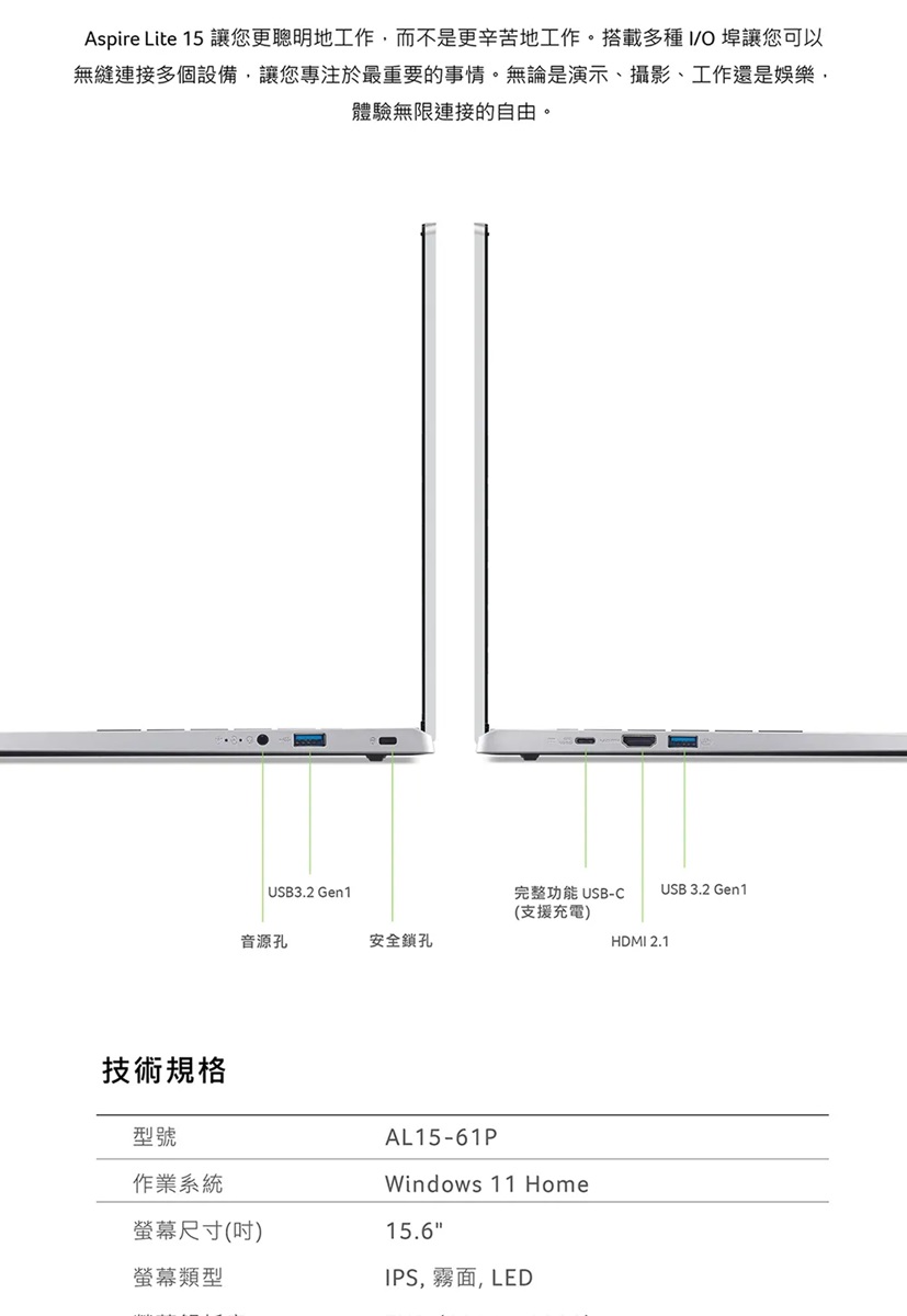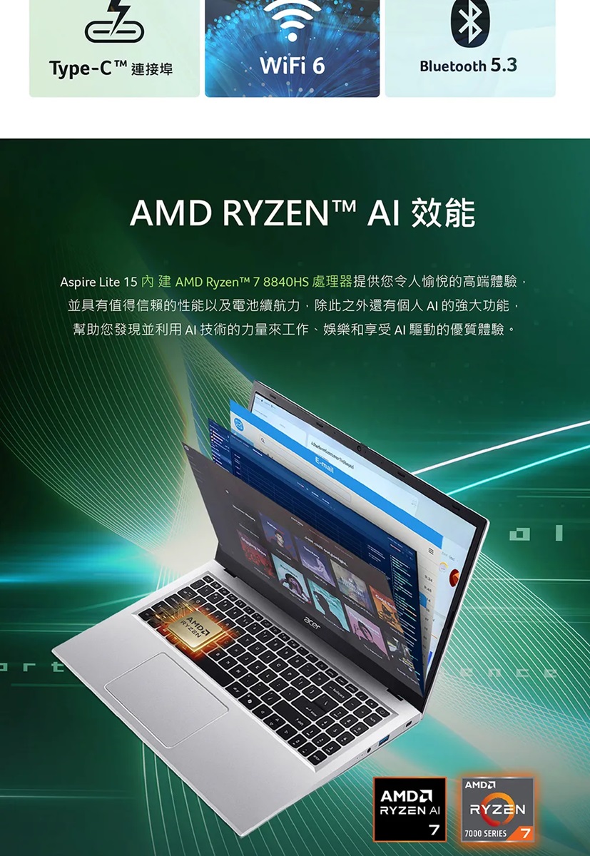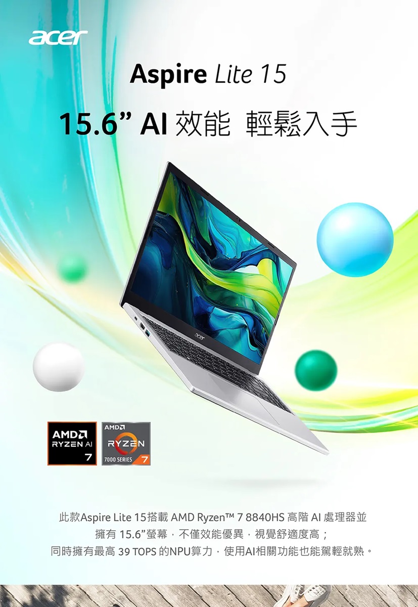 Acer宏碁 Aspire Lite AL15-61P-R5J1 R7-8840HS/8G+8G/512G/效能筆電