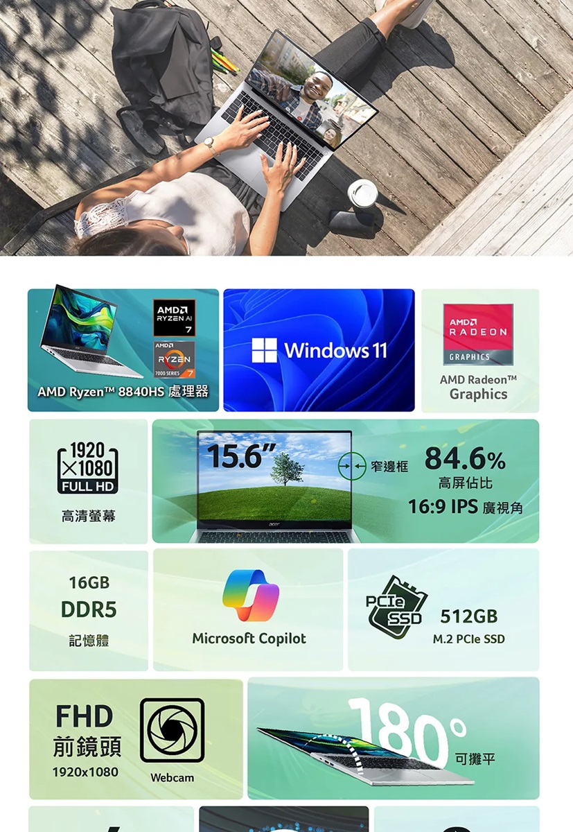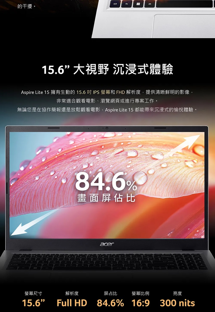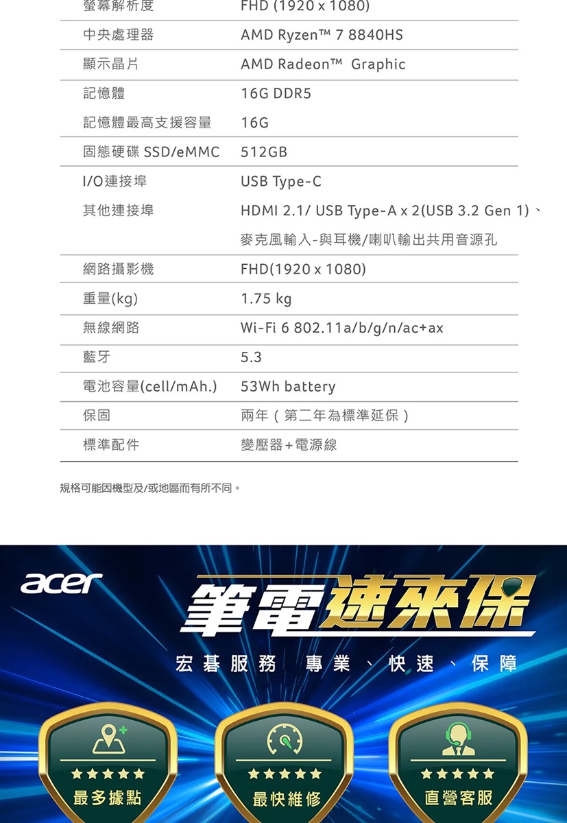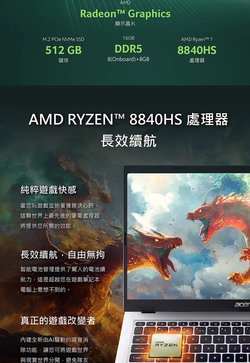 Acer宏碁 Aspire Lite AL15-61P-R5J1 R7-8840HS/8G+8G/512G/效能筆電