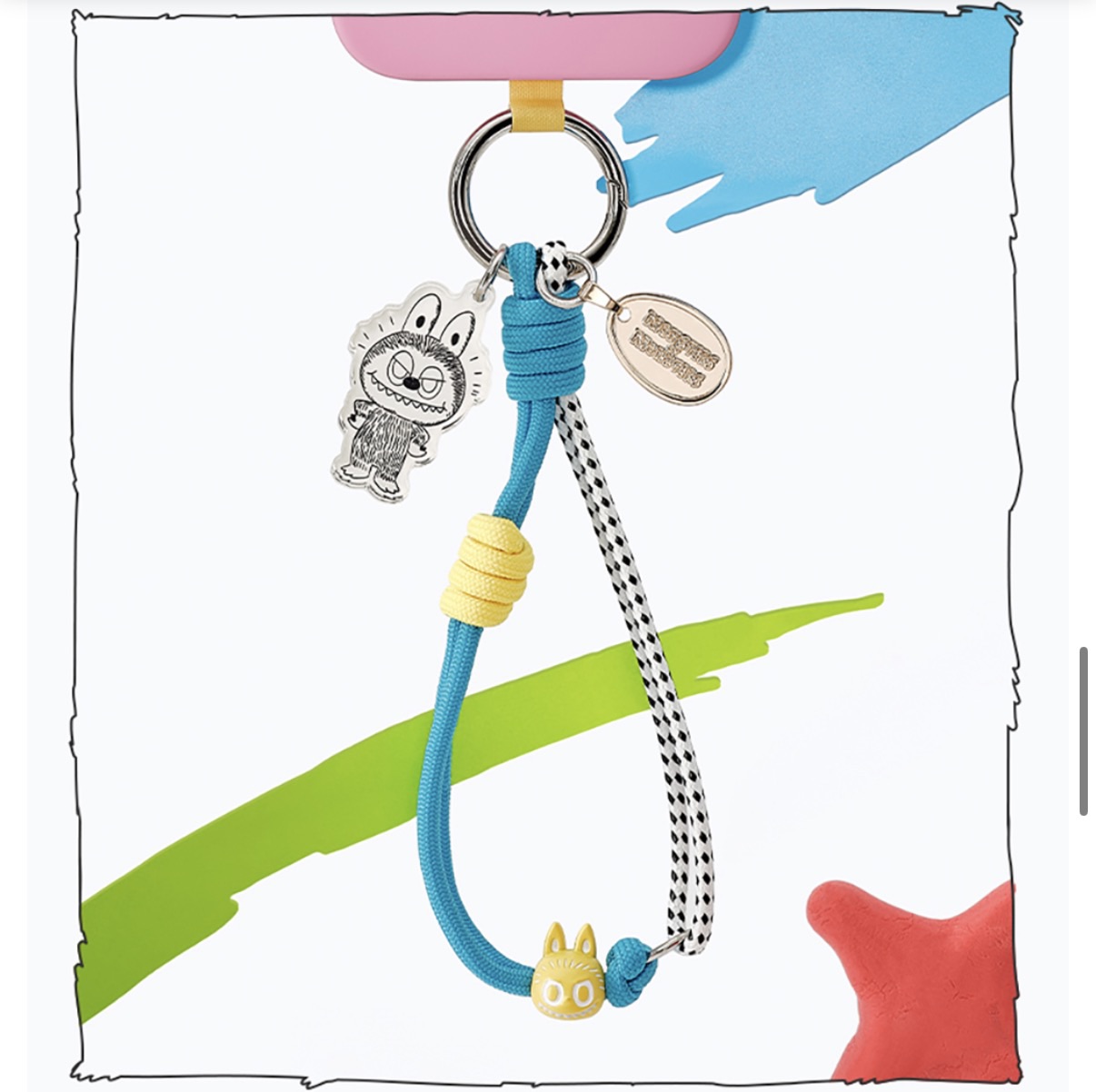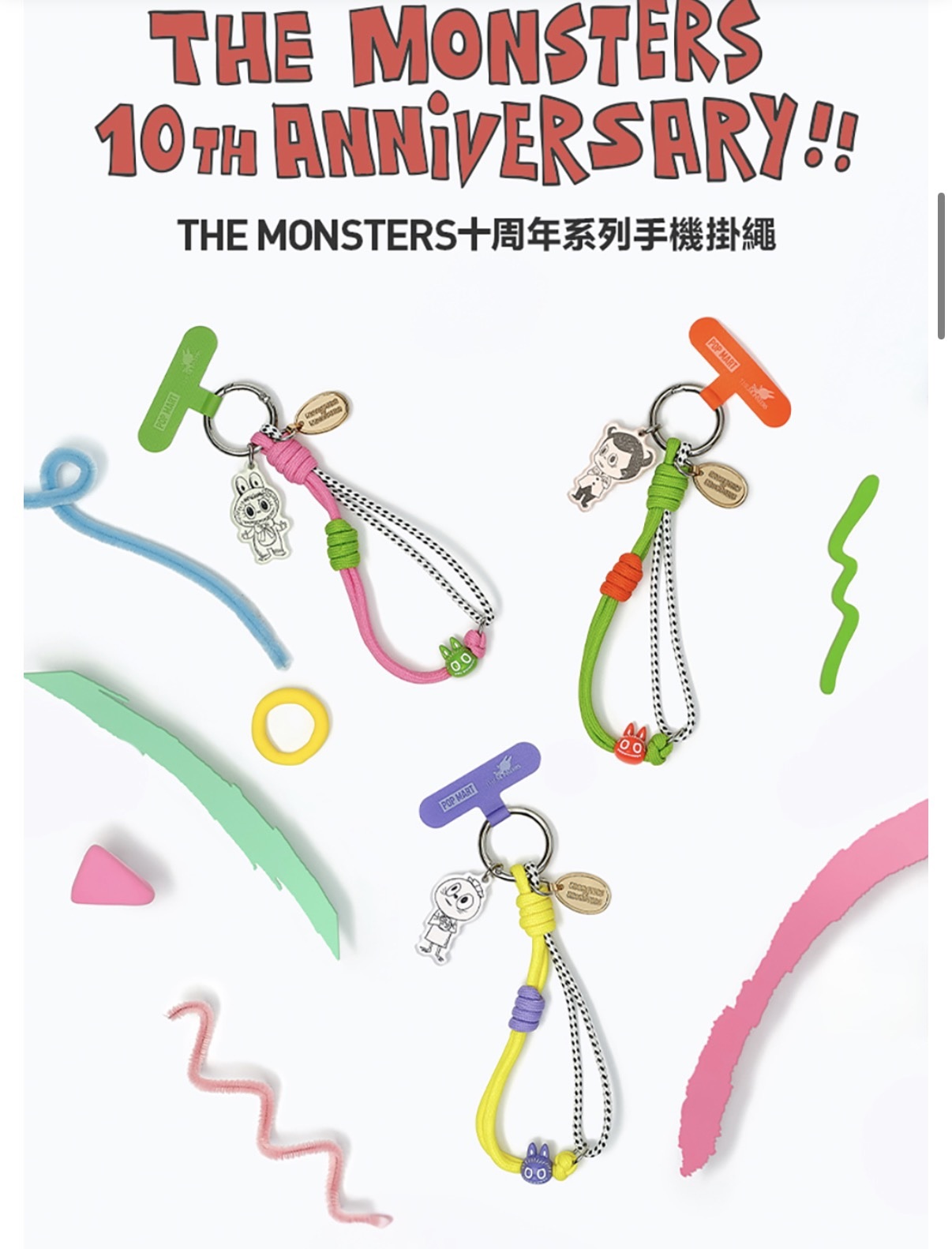 THE MONSTERS 十週年系列 手機掛繩(手機掛鍊),是專為 LABUBU 十週年慶典設計的隨身飾品 ,該產品以盲盒形式販售,將經典角色與潮流掛繩結合,是粉絲每日必帶的紀念收藏。