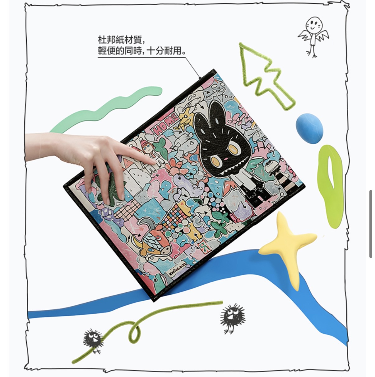 LABUBU 電腦包,是 2026 年初為了慶祝 LABUBU 誕生十週年所推出的實用潮流周邊。這款電腦包以特殊的杜邦紙材質結合 LABUBU 經典插畫,主打文藝且輕便的設計感。