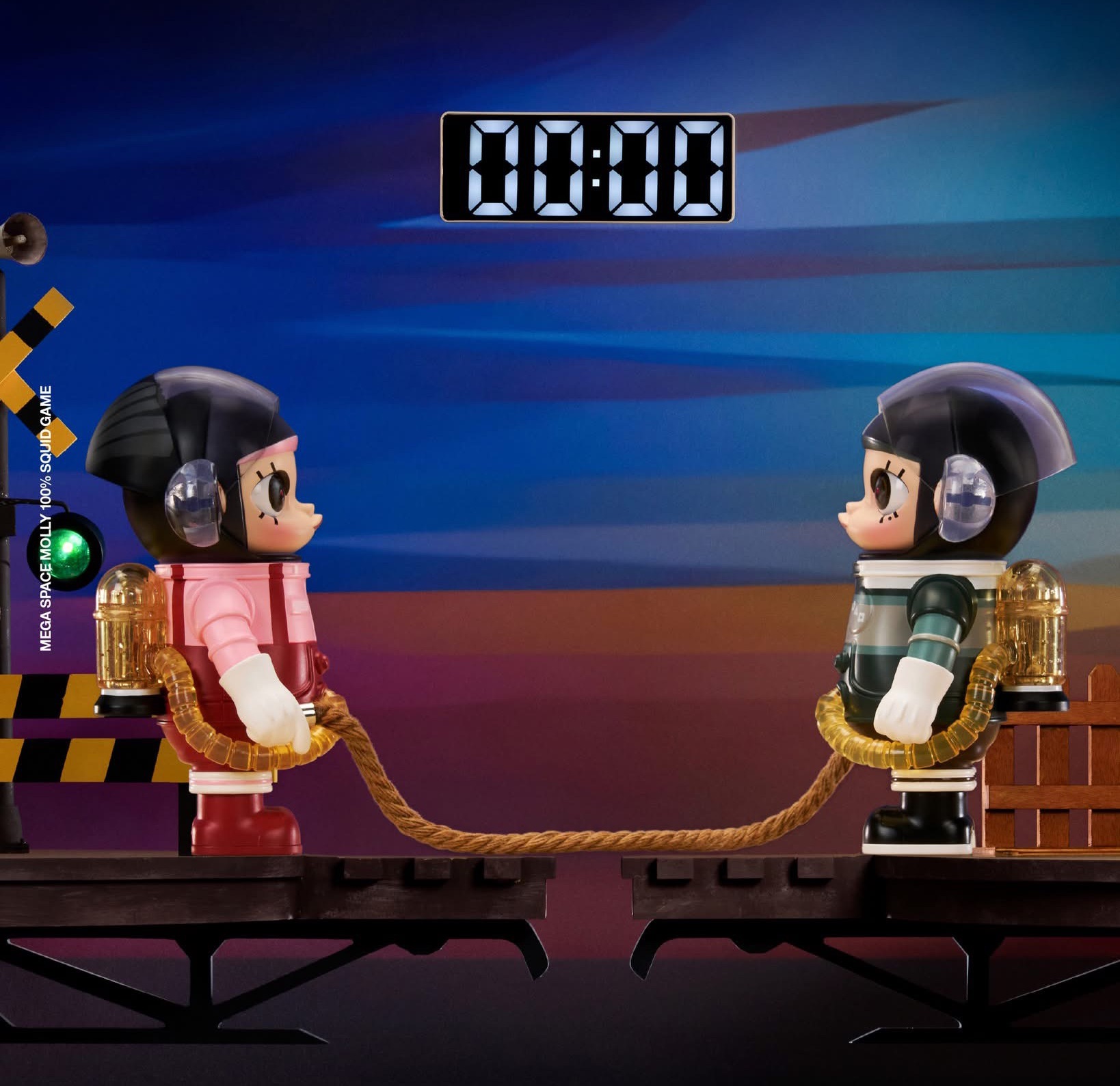 POP MART(泡泡瑪特) 與 Netflix 全球熱門影集 《魷魚遊戲》(Squid Game) 聯名推出的 MEGA SPACE MOLLY 100% 吊卡,是將 Molly 的經典宇航員形象與