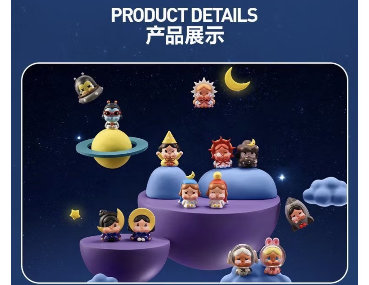 POPMART 泡泡瑪特 CRYBABY 哭娃 出走的月亮 - 坐坐系列 是將原本大尺寸的公仔縮小,並統一設計為「坐姿」造型的迷你盲盒系列。坐坐系列體積更小巧,非常適合擺放在電腦螢幕前