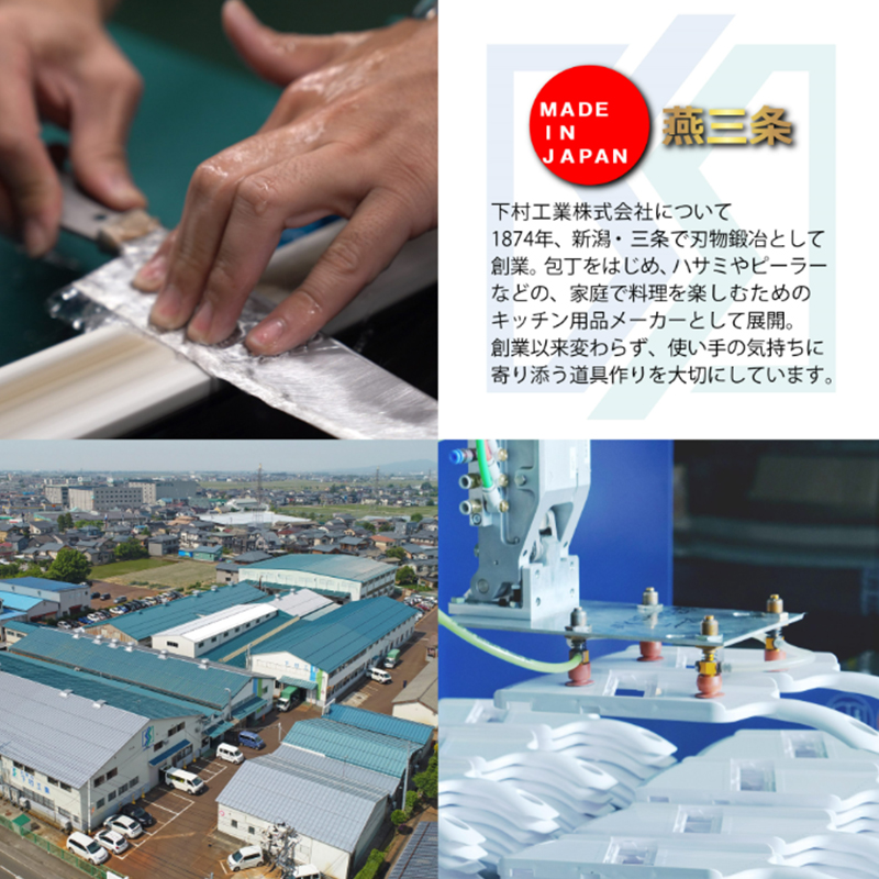 『下村工業』於1874 年在日本新潟縣三條市成立,主要做刀具鍛造的製造廠,生產刀具、剪刀、削皮器等家用烹飪用品。