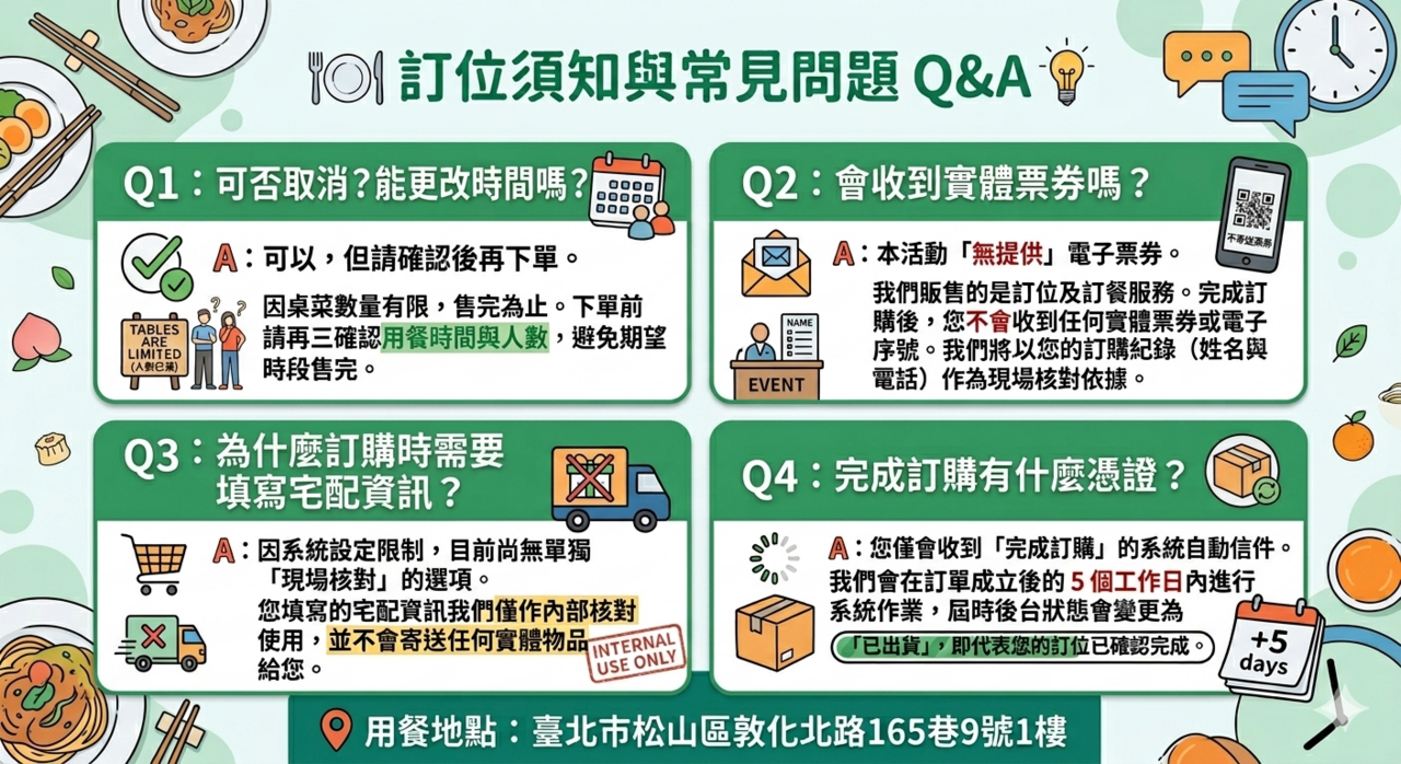 不可改期: 由於 5/9、5/10 均屬限量特約檔期,訂單確認日期與人數後,恕不接受更換日期、餐期或桌型。
