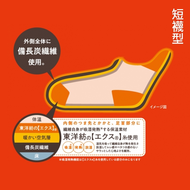 整雙襪子使用備長碳纖維,備長碳本身就會釋放微遠紅外線,所以搭配東洋紡的專利紗線整個就是能促進血液循環又能保暖!(請好好看圖解)