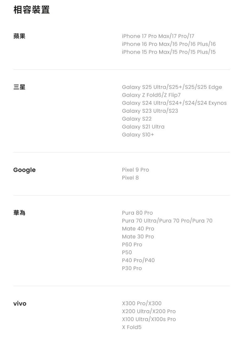 Samsung三星Galaxy S25 Ultra、Galaxy S25 、Galaxy S25、Galaxy S25 Edge、Galaxy Z Fold6、Galaxy Z Flip7、Galaxy S24 Ultra、Galaxy S24 、Galaxy S24、Galaxy S24(獵戶座版)、Galaxy S23 Ultra、Galaxy S23、Galaxy S22、Galaxy S21 Ultra、Galaxy S10GooglePixel 9 Pro、Pixel 8華為Pura 80 Pro、Pura 70 Ultra、Pura 70 Pro、Pura 70、Mate 40 Pro、Mate 30 Pro、P60 Pro、P50、P40 Pro、P40、P30 ProOPPOFind X9 Pro、Find X8 Ultra、Find N5、Find X7 UltravivoX300 Pro、X300、X Fold5、X200 Ultra、X200 Pro、X100 Ultra、X100s ProiQOOiQOO 15、iQOO 13OnePlusOnePlus 15、OnePlus 13、OnePlus 12、OnePlus 8 Pro榮耀Magic 7 Pro、Magic 6 Pro、Magic V5小米Xiaomi 17 Pro、Xiaomi 17、Redmi K90 Pro Max、Xiaomi 15 Pro、Xiaomi 15、Xiaomi MIX Fold 4、Xiaomi 14 Pro、Xiaomi 14ZTE中興Axon 40 Ultra
